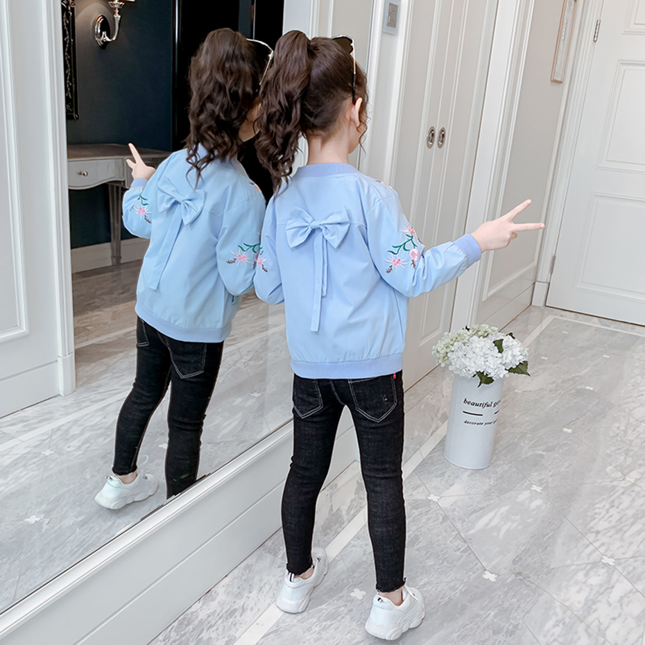 Giacca bomber da bambina con fiori ricamati e fiocco