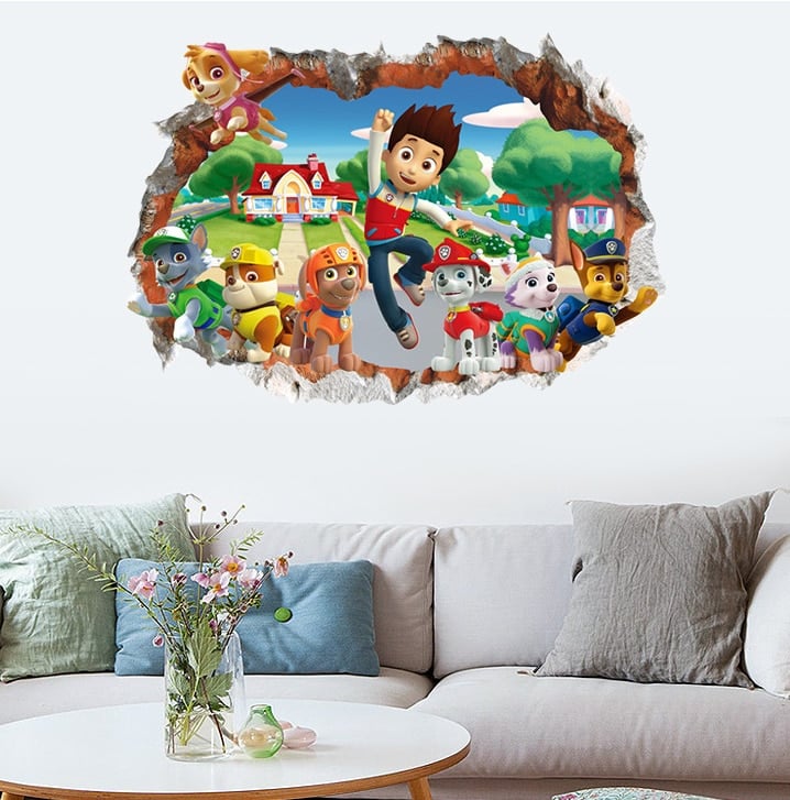 Questo adesivo Patrol di grandi dimensioni da appendere alla parete rappresenta la squadra, con Ryder in testa, che sfonda il muro, come per entrare a giocare con sua figlia. Dà un bell’effetto trompe-l’oeil