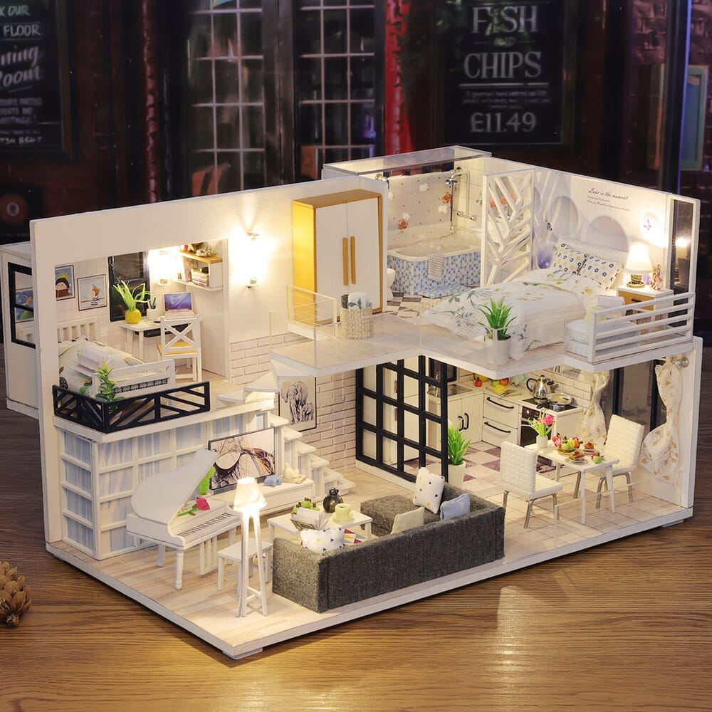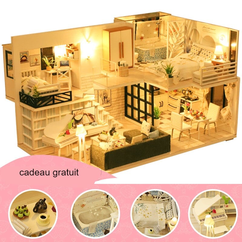 Questa casa delle bambole per bambina è arredata con molti pezzi come un pianoforte, un letto, una sedia, un divano, ecc. Grazie a tutti i suoi accessori, questa casa in miniatura sembra molto realistica!