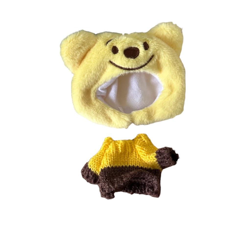 petite tenue jaune et marron avec capuche d’ours souriant, portée par une peluche Labubu aux yeux fermés.