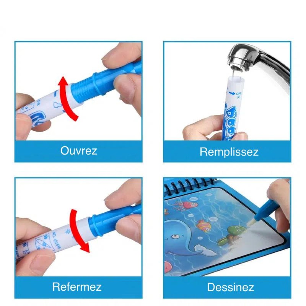 Ecologico, riutilizzabile e sicuro per il suo bambino, questo libro da colorare è infinitamente riutilizzabile grazie alla sua penna ad acqua! Basta riempirla d’acqua prima di disegnare sul libro da colorare. Quando il bambino disegna, le forme e i motivi appaiono grazie all’acqua, rendendo facile imparare a colorare.