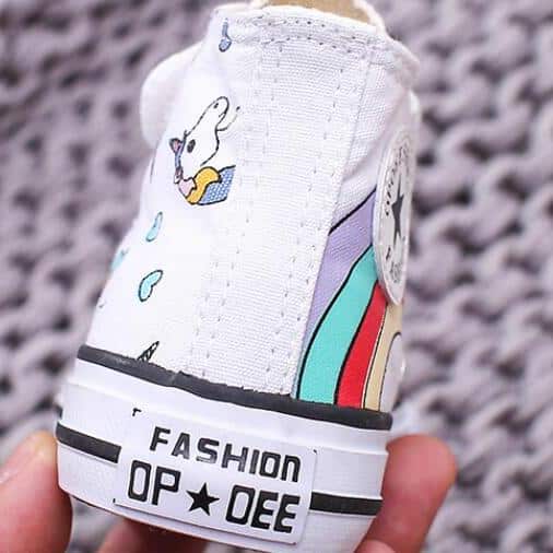 Un paio di scarpe stile Converse con motivo di unicorno e arcobaleno disegnato come un graffito